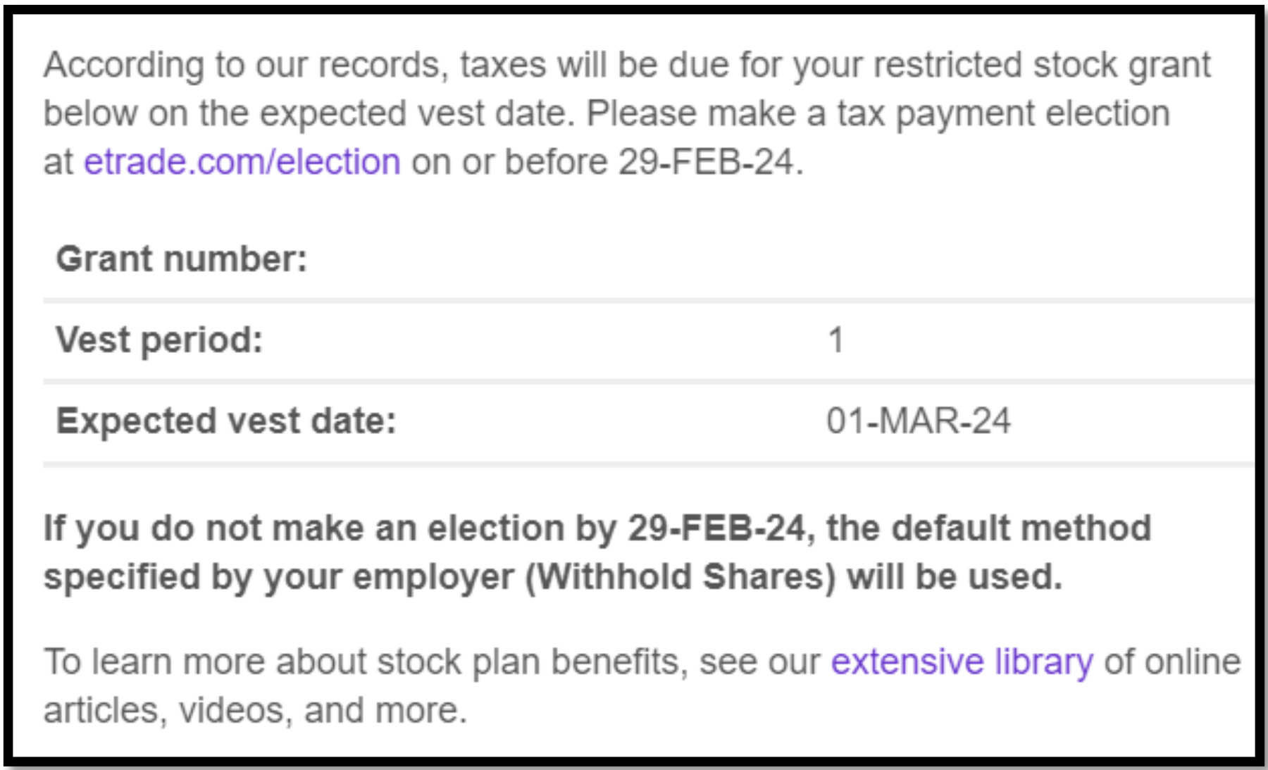 - Ensure proper withholding elections. You will need to make tax payment elections at your custodian prior to the vesting date. Typically, you have two options.